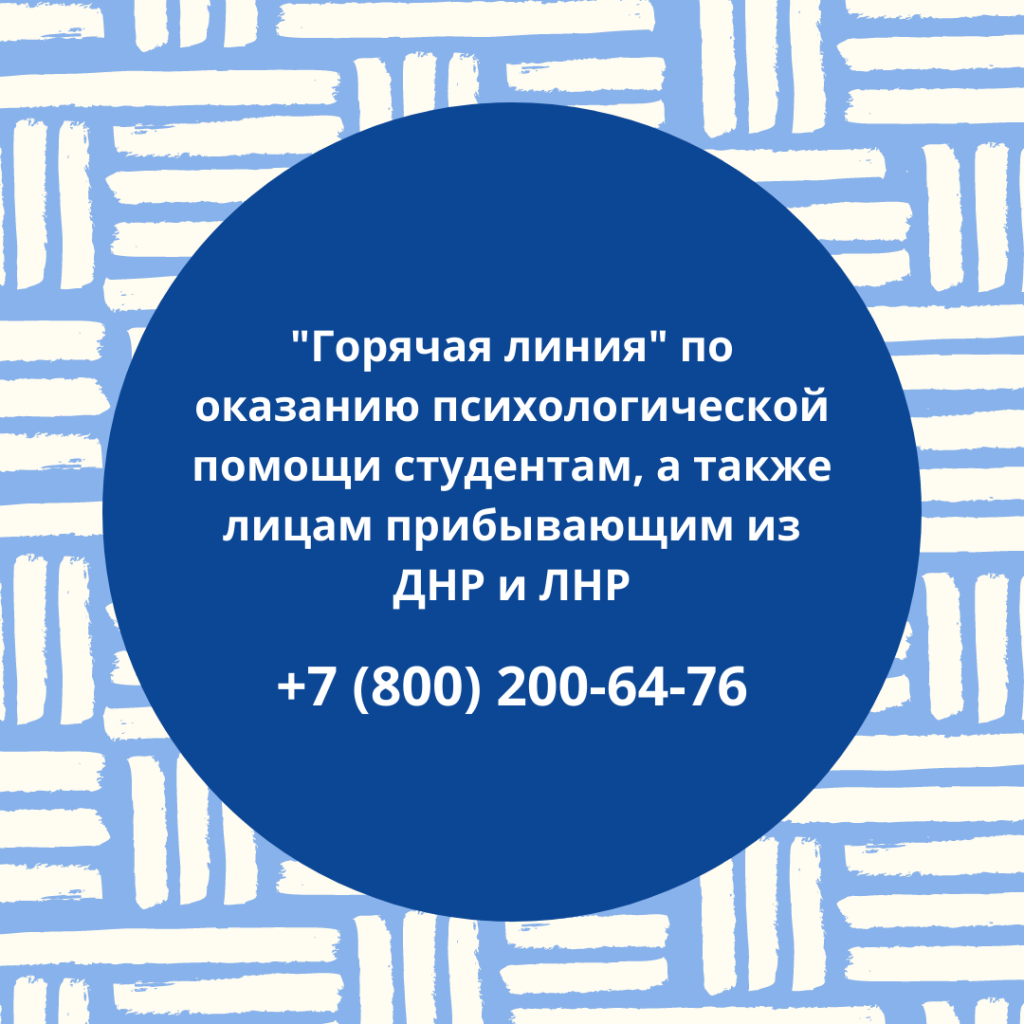 По инициативе Министерства науки и высшего образования на базе научно-образовательного центра психологического сопровождения личностно-профессионального развития с 28 февраля работает «горячая линия» по оказанию психологической помощи студентам, в том числе иностранным гражданам, а также лицам, прибывающим из ДНР и ЛНР.