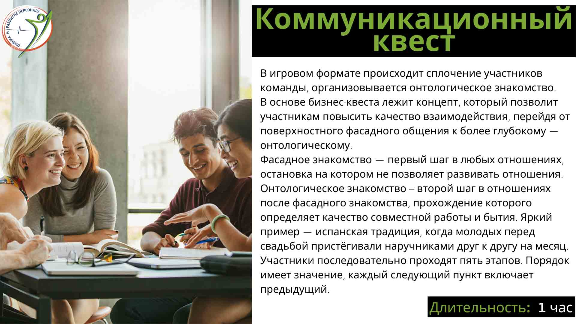 Коммуникативный квест Стоимость участия — по запросу. Запись на тренинг по телефону: +7 (988) 843-56-48